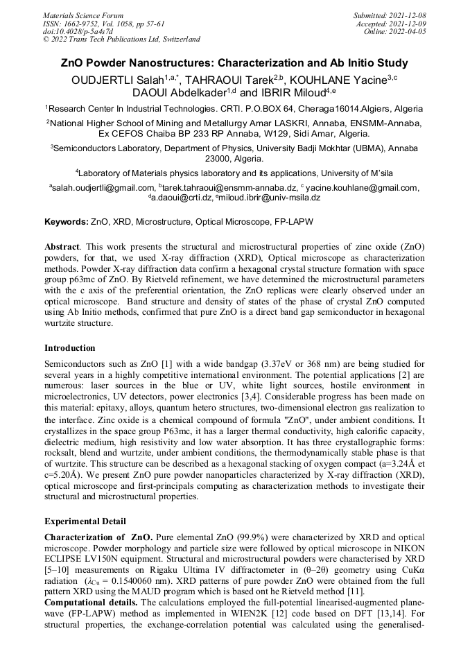 | Title: | ZnO Powder Nanostructures: Characterization and Ab Initio Study |